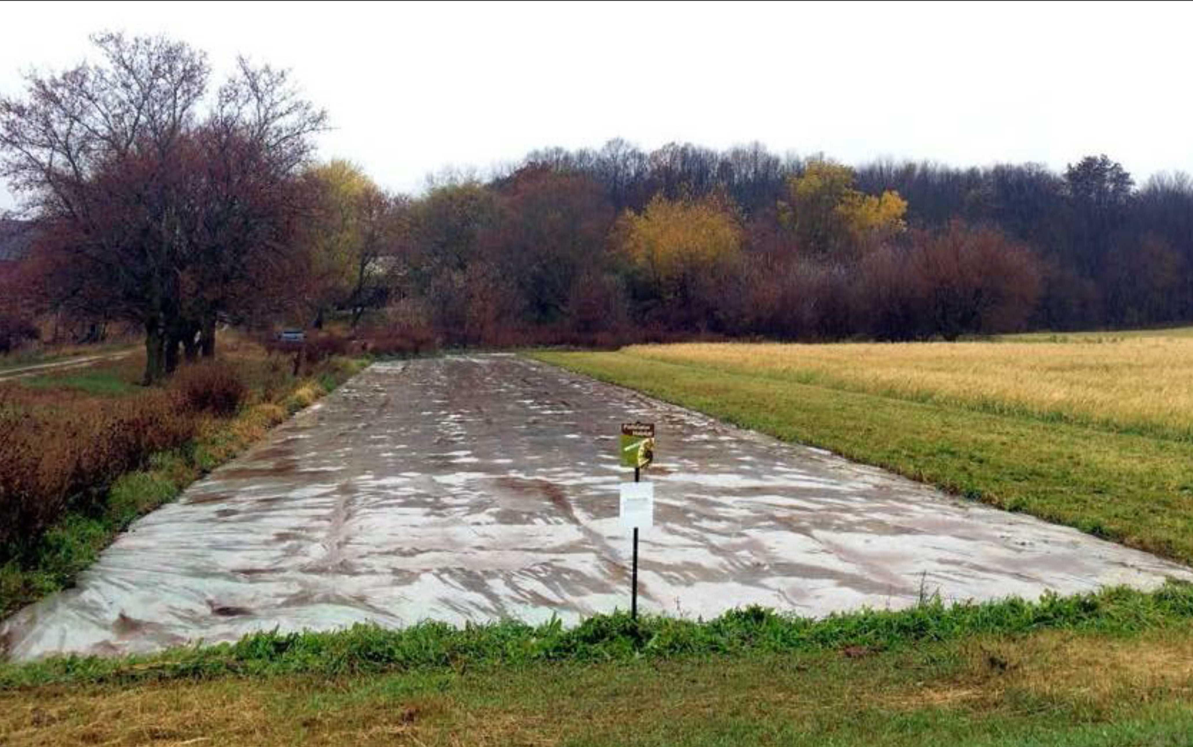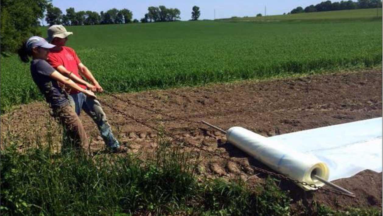 One piece of plastic can be reused on a large site over multiple years—increasing the size of the habitat planting. This ¼ ac area was solarized with 6 mil UV-stable high tunnel plastic during summer . That fall, the plastic was unburied on three sides and flipped over to the right (middle). The uncovered area was seeded (right) and the plastic was pulled taut over the newly covered area and the three edges were buried.